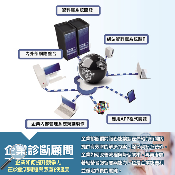 全面性系統整合是一種將想法彙整並加以規劃成一種邏輯概念的專業技術。透過電腦演算,我們可以更有效的處理傳統人力作業的繁瑣事務,結合各種資訊產品及平台上開發,系統整合得以滿足各項作業上的需求。